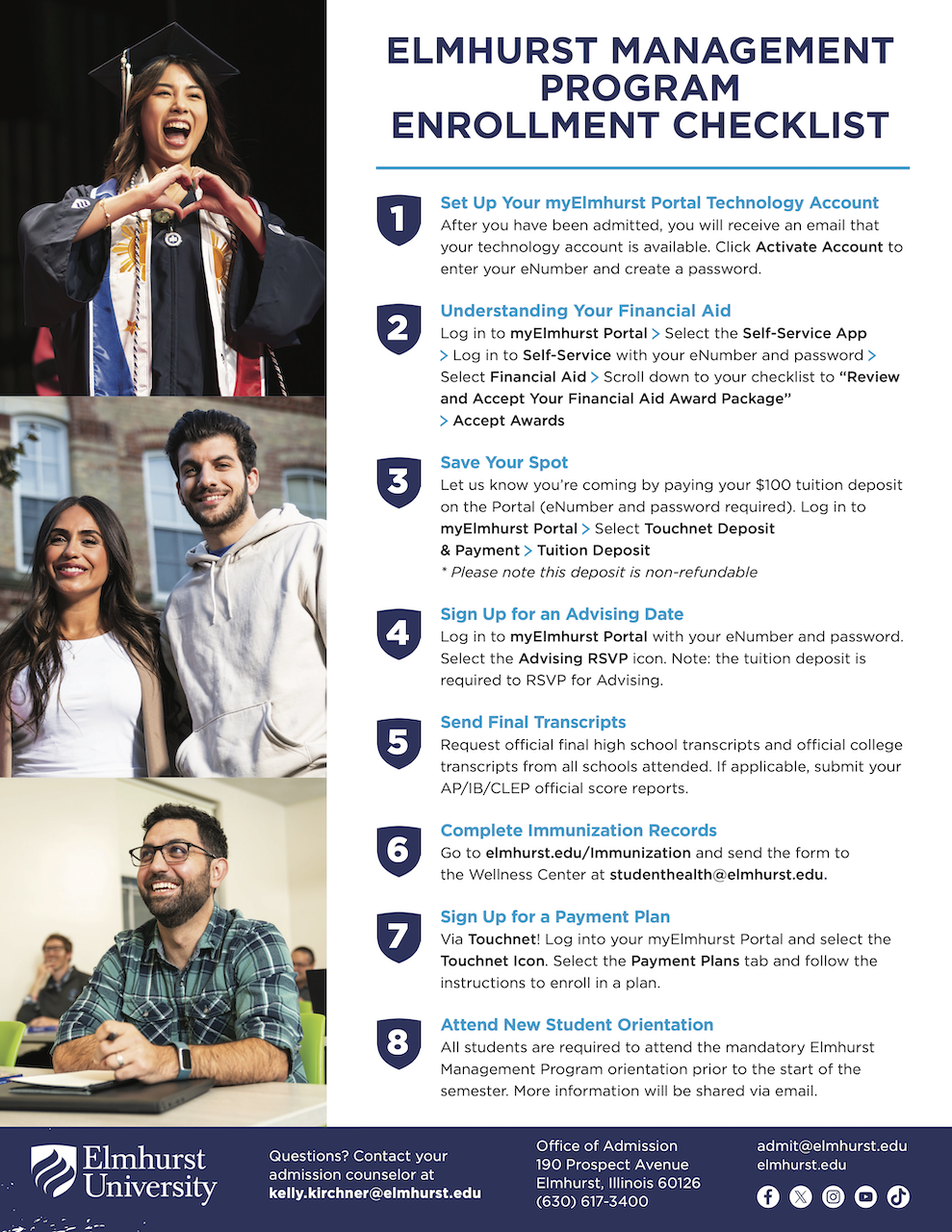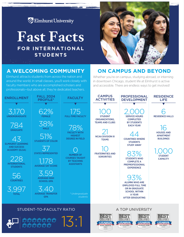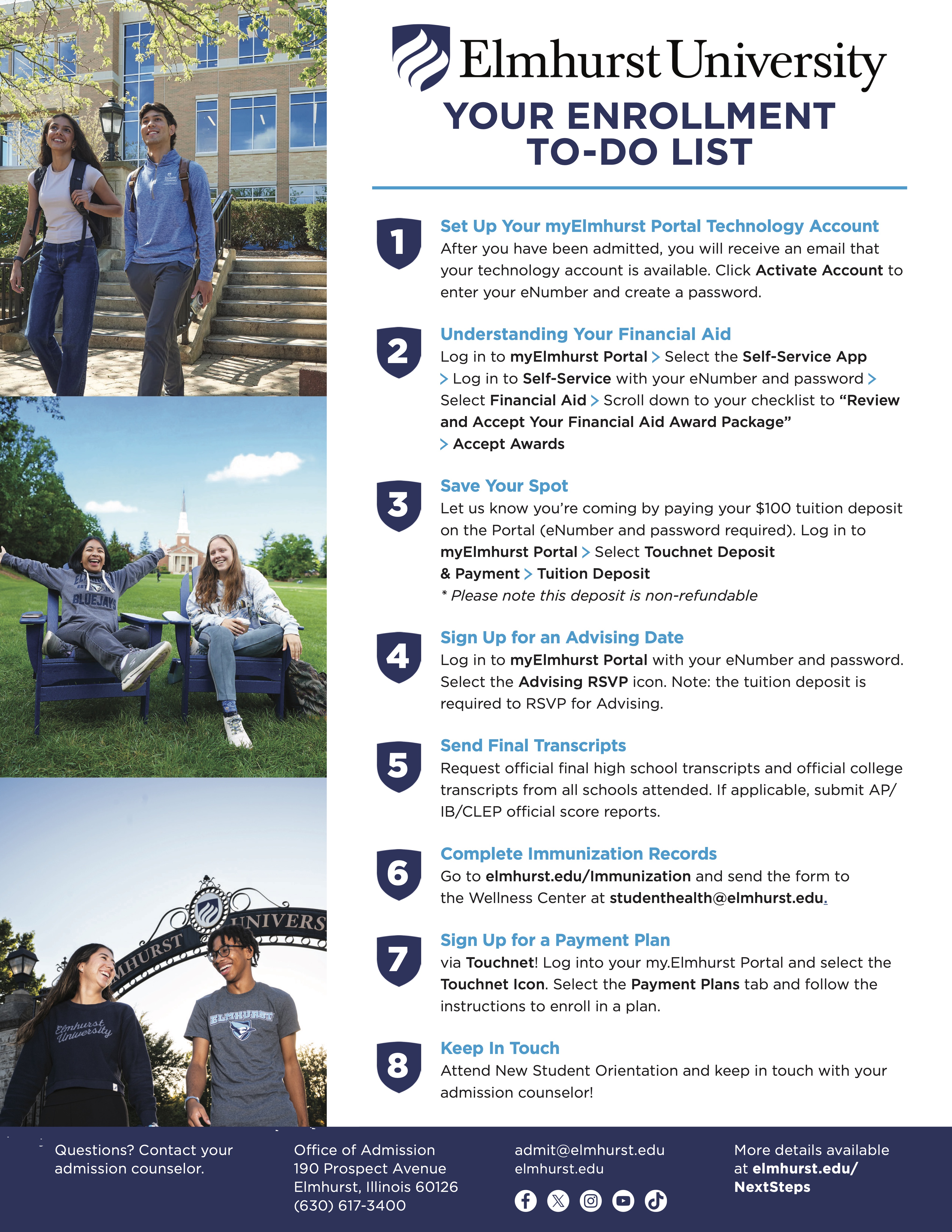 Take a look at Elmhurst University's all-in-one guide to campus life, student support, hands-on learning, and the key steps and dates you need to become a Bluejay!