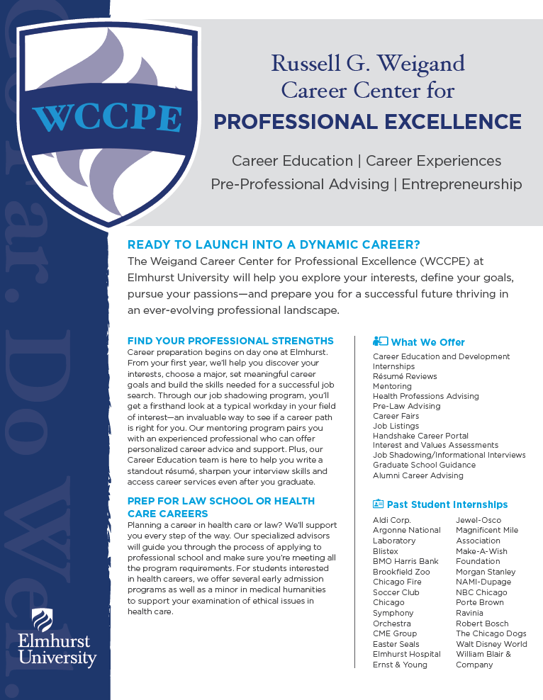Learn more about Elmhurst University's Wegand Career Center for Professional Excellence (WCCPE), where you can explore careers, gain real-world experiences and get support with resumes, internships and professional development.